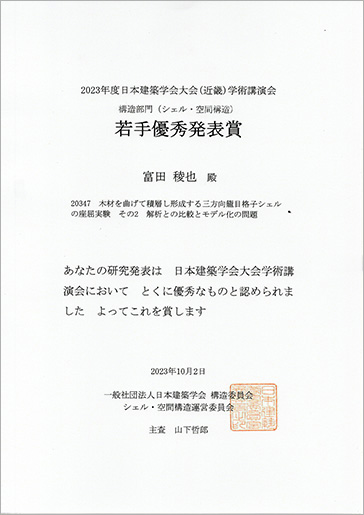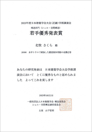 2023年9月に京都大学で開催された2023年度日本建築学会大会(近畿)学術講演会において、建築学専攻の富田稜也さん、北牧さくらさん(ともに山下研究室・山下哲郎教授)が構造部門(シェル・空間構造)の若手優秀発表賞を受賞しました。
