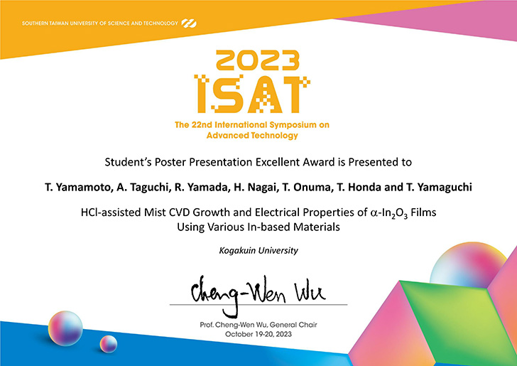 2023年10月19-20日に南台科技大学(台湾)で開催された国際学会The 22nd International Symposium on Advanced Technology (ISAT-22)において、電気・電子工学専攻2年の山本拓実さん(結晶成長研究室・山口智広教授)がStudent's Poster Presentation Excellent Awardを受賞しました。