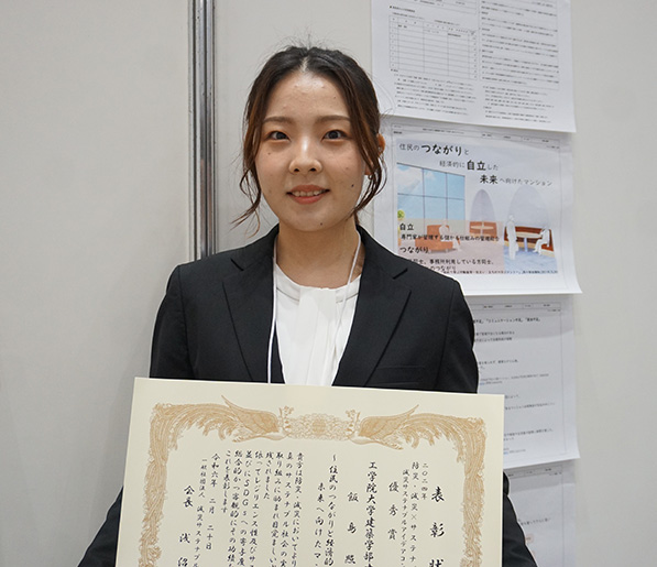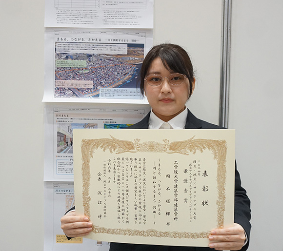 表現・整理度、着目・発想度、地域特性認識度などの5項目について審査されました。2月20日に東京ビッグサイトで行われた表彰式では、受賞者代表として岡本さんは作品内容の紹介と感謝をスピーチしました。この審査にはローマ大学の教授も参加し、同教授は優秀賞となった飯島さんの作品に大変関心を持ちました。教授は個別に英文の賞状を用意くださり、飯島さんに授与されました。