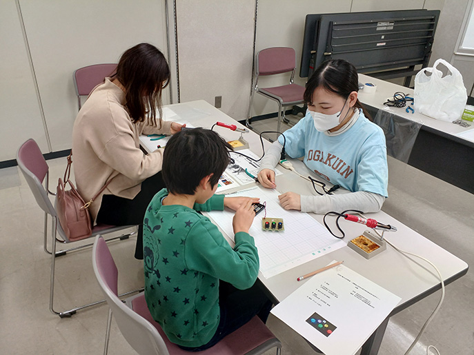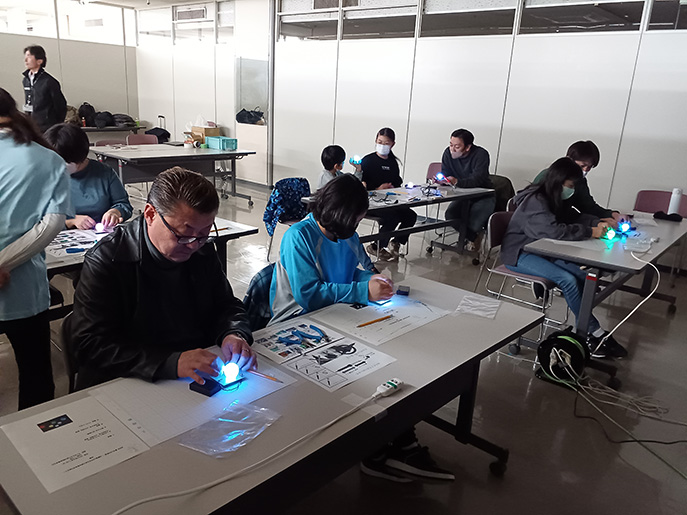 親子教室では、LEDについてのミニ講義と様々な光の色を作り出すキッド製作を通して、LEDが発する光の魅力を親子に体感してもらいました。