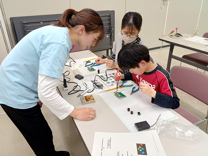 長野市・善光寺を中心としたエリアを光で彩る「善光寺表参道イルミネーション」イベント(2023年12月23日~2024年2月12日開催)の一環で、山口智広教授(応用物理学科)と、電気・電子工学専攻修士1年の山田琴乃さん、先進工学部応用物理学科4年の月岡知里さん(ともに結晶成長研究室・山口智広教授)が、2月10~11日の2日間、親子LED教室を実施しました。
