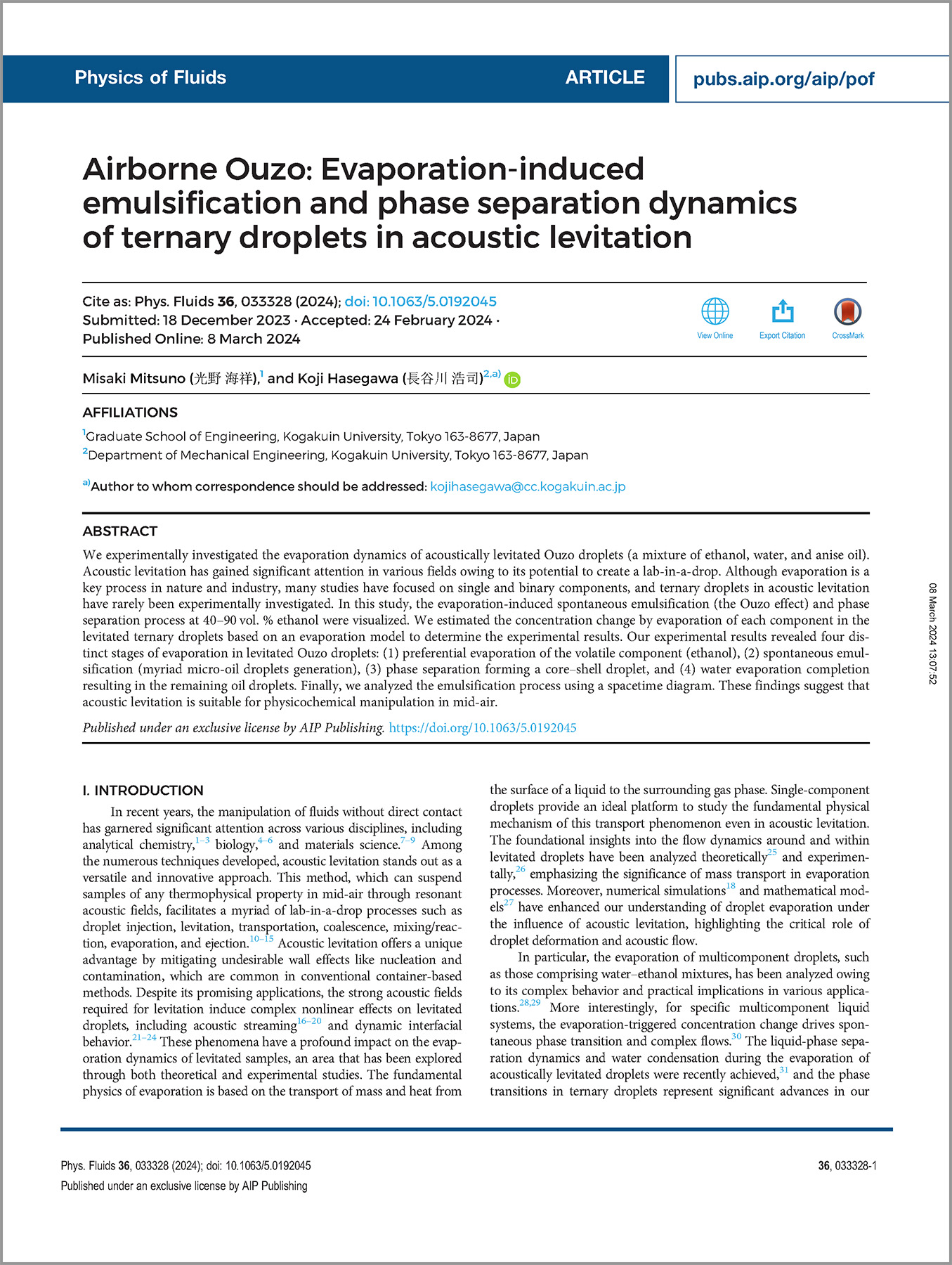 本論文では、音響場で浮遊させたエタノール、水、アニス油から成るウーゾ液滴の蒸発、乳化、相分離過程を明らかしました。得られた結果によって、音響場を駆使した非接触での液滴内の物理化学的な操作の実現可能性を示しました。