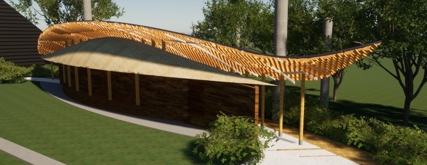 設置場所は建築重機が入れない場所のため、学生たちは、まず建設予定地の根切りを手作業で進めました。木材は、林業振興と木材流通を学ぶ観点から、一部は角材や板状では無く、丸太の皮を剥いだ状態で納品され、その良さが活きるように設計しました。