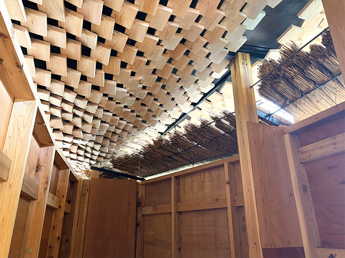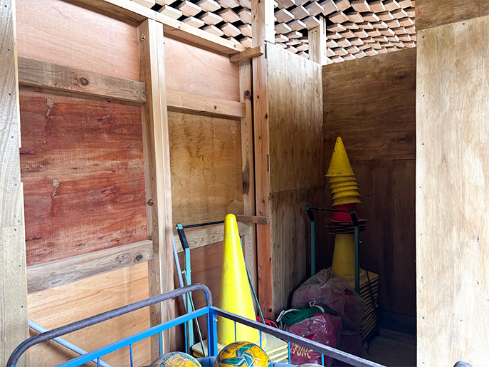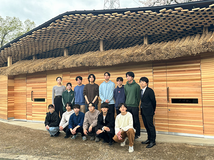 同プロジェクトは、キャンパス内で木造倉庫を建てる活動を2017年から続けています。今回完成した5棟目は、株式会社東京チェンソーズと株式会社繁田尊友建築設計事務所の協力のもと制作しました。流線型のデザインは、建物奥に位置する弓道場に配慮したもので、曲線に沿って並ぶ列柱状の通路はそこへ続くアプローチを意識した設計です。