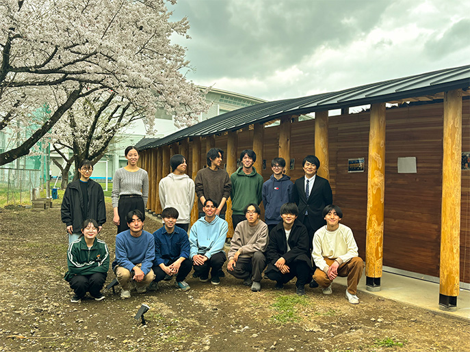 作業に際しては、狭い場所のため、学生達は重機を使わずに手作業で進めました。2月には土台部分に大雪が積り、まず雪をかきだすことから始めたり、春休みは毎日のように現場で汗を流したり、苦戦しながら約4カ月かけて完成させました。 竣工式では、後藤治理事長がこれまでのK×Kプロジェクトの経緯を紹介し、青木亮輔氏(株式会社東京チェンソーズ、代表取締役)は林業の現状を触れつつ、「これからの社会を担う学生に木の良さを知ってもらえたら嬉しい」と挨拶しました。同日は、多摩地域や木材を扱うメディアが6社来校し、式典後は撮影や学生インタビューが30分ほど続きました。