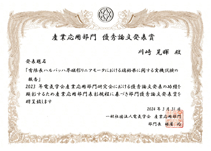 2023年7月6日に信州大学で開催された電気学会 マグネティックス/リニアドライブ合同研究会において、電気・電子工学専攻修士課程2年の川崎晃暉さん(電磁力応用システム研究室・森下明平教授)が優秀論文発表賞を受賞しました。