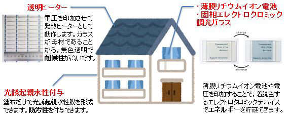 | 透明ヒーター | 電圧を印加することで発熱する無色透明で耐候性の高いヒーターを実現。 |