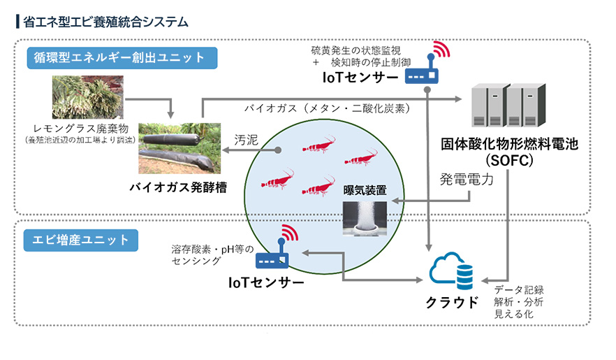IoTによる「エビ増産ユニット」では、IoTデバイスを使い、溶存酸素濃度、pHなどをセンサーで計測するほか、IoTプラットフォームを設計、養殖池の水質データに加え、バイオガス発酵槽とSOFCの状態監視などを含むデータの保存、可視化を行い、データの閾値監視やアラート通知機能などのシステムを構築することで、養殖環境とエビの育成状況との相関性を分析します。エビにとって最適な養殖環境を見出し、養殖効率向上を目指します。
