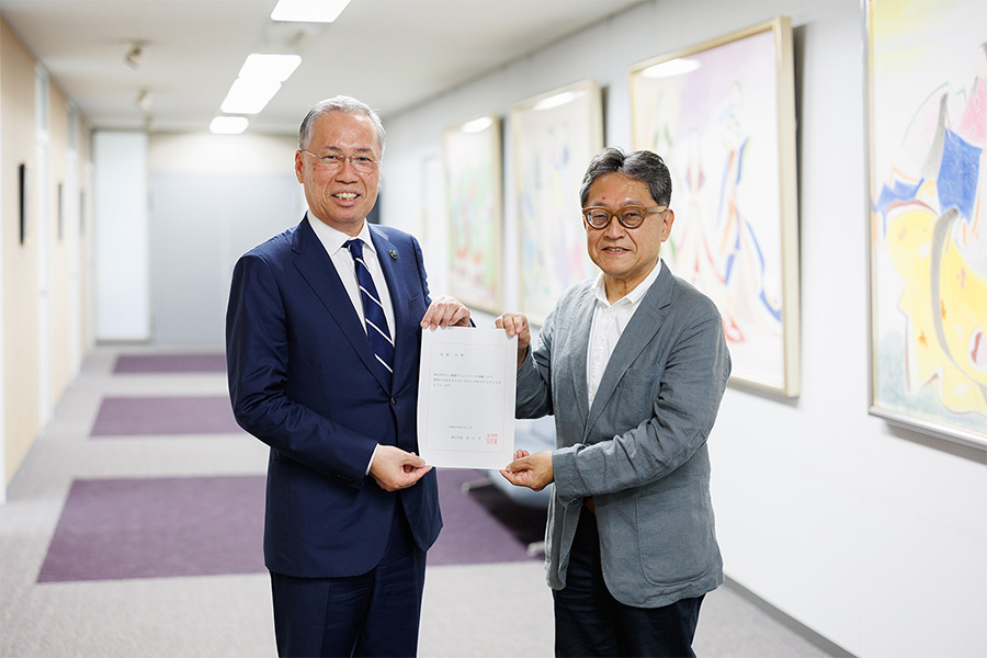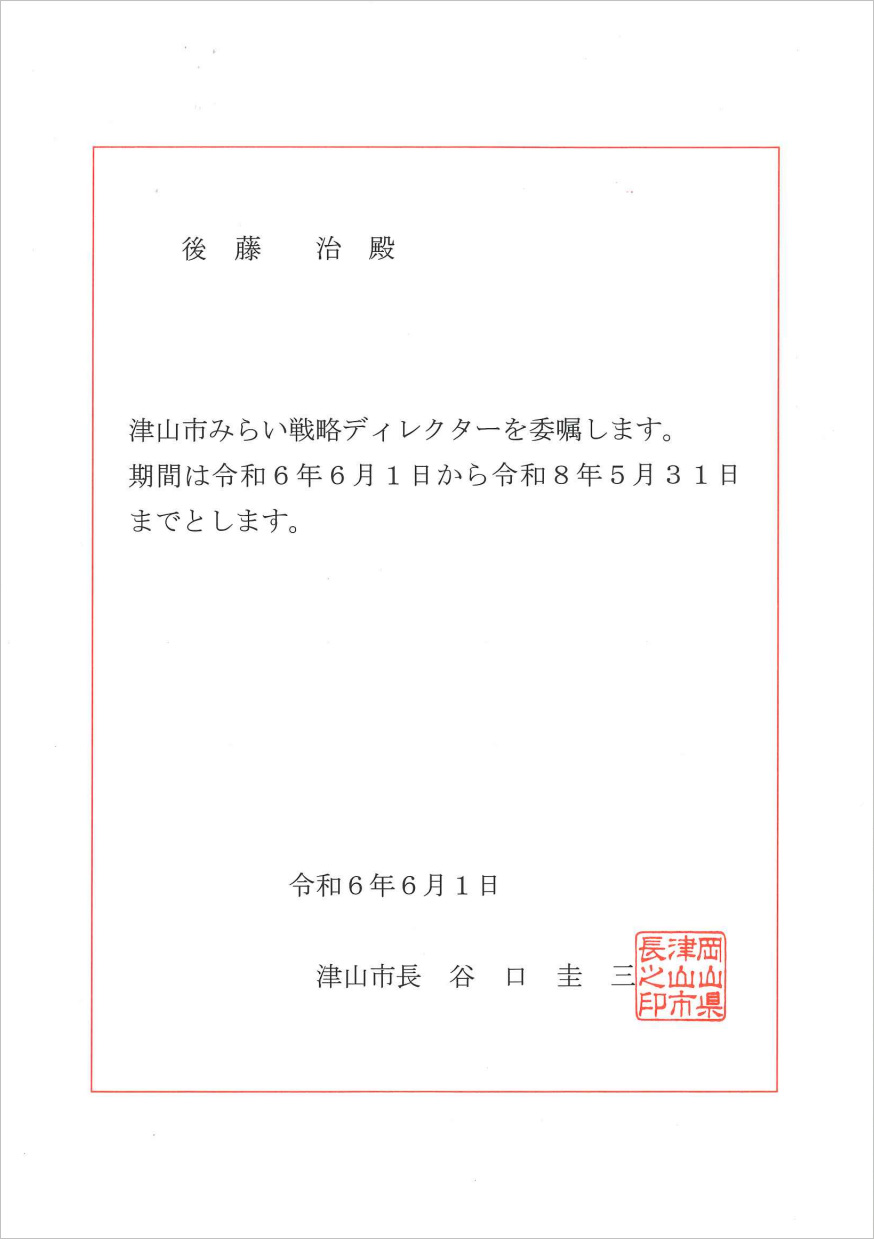 Home 2024年度のお知らせ 後藤理事長が岡山県津山市のみらい戦略ディレクターに就任しました 後藤理事長が岡山県津山市のみらい戦略ディレクターに就任しました 2024/06/14 シェアする 後藤理事長が、岡山県津山市のみらい戦略ディレクターに就任し、6月12日、津山市 谷口圭三市長から委嘱状を受け取りました。津山市は、岡山県の北部に位置する、歴史と自然が豊かな地域です。江戸時代には津山城の城下町として栄え、当時の遺構や伝統的な町並みが現在も残されています。後藤理事長はみらい戦略ディレクターとして、津山城の歴史資産を活かした街の発展に協力します。 谷口圭三 津山市長(写真左)、後藤治 理事長(写真右) 前へ 一覧に戻る 次へ
