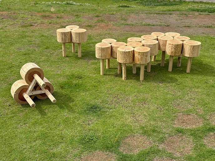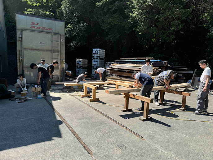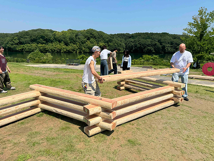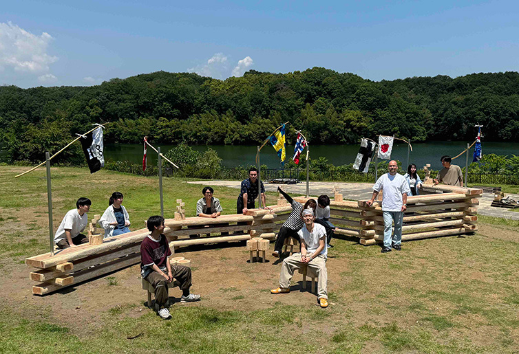 デザイン案は、トルヴィネン氏とのオンラインミーティングを経て決定され、株式会社フォレスト西川の材料提供および部材加工の協力のもと、来日したトルヴィネン氏と共に組み立て、6月15日のコッコ点火式でお披露目されました。鈴木研究室のメンバーは総出で原木を磨き、北欧各国の旗をパッチワークでアートピースとして制作しました。