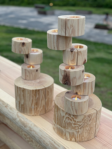 本プロジェクトでは、フィンランドから建築家のヤーッコ・トルヴィネン氏を招聘し、鈴木研究室と共同で、埼玉県原産の材木である西川材を用いたワークショップを実施しました。トルヴィネン氏は、ヘルシンキのリトルフィンランディアの原木の柱からインスピレーションを得て、北斗七星の形状の「原木のバーカウンター」、三つ脚の「原木のスツール」や「原木のキャンドルベース」を制作しました。