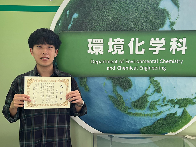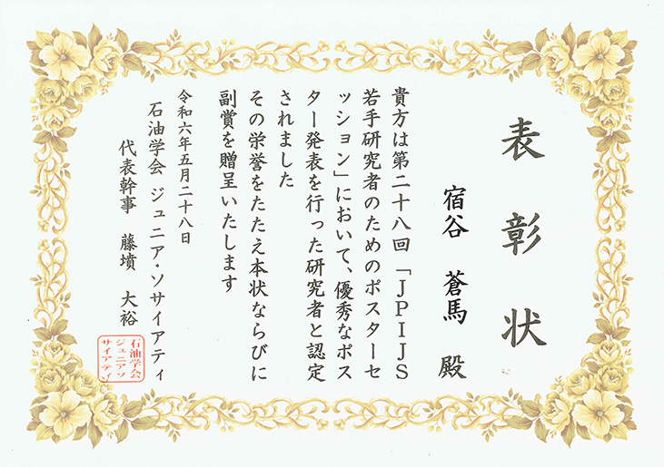 5月28日から29日に開催された石油学会第66回年会の第28回JPIJSポスターセッションにおいて、化学応用学専攻修士1年の宿谷蒼馬さん(大気環境触媒工学研究室・並木則和教授/前野禅准教授)が優秀賞を受賞しました