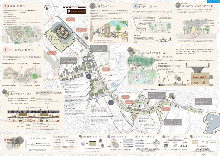 - 課題解決のプロジェクトを雫と見立てて、魅力的な場がじわじわ広がり混ざりあうことでまちが形成されるという考え方が面白い。滲彩(シェンツァイ)は「地元への愛着がにじみ、市民・観光客のにぎわいが土浦を彩る」という意味だと説明があるとおり、イメージ全体に心を豊かにしてもらうおもてなしが感じられる。
