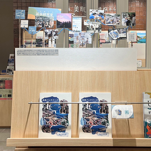 取材は7月16日に会場の日比谷しまね館(日比谷シャンテB1階)にて行われ、冨永研究室大学院2年の3名が展示物を案内しながら写真の内容を説明しました。