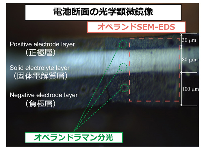 オペランド走査電子顕微鏡-エネルギー分散X線分光計測(SEM-EDS)により断面全体(~数百マイクロメーター)での元素分布変化、オペランドラマン分光計測により正極層/固体電解質層/負極層内のスポット(~数マイクロメーター)における構造変化をそれぞれ個別に観測した。