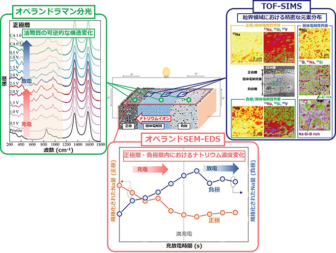 - 正極/固体電解質/負極の積層構造からなる全固体ナトリウム電池において、電池の動作下でラマン分光計測、走査電子顕微鏡観察および飛行時間型二次イオン質量分析を同一断面試料に適用するマルチスケール分析を構築しました。