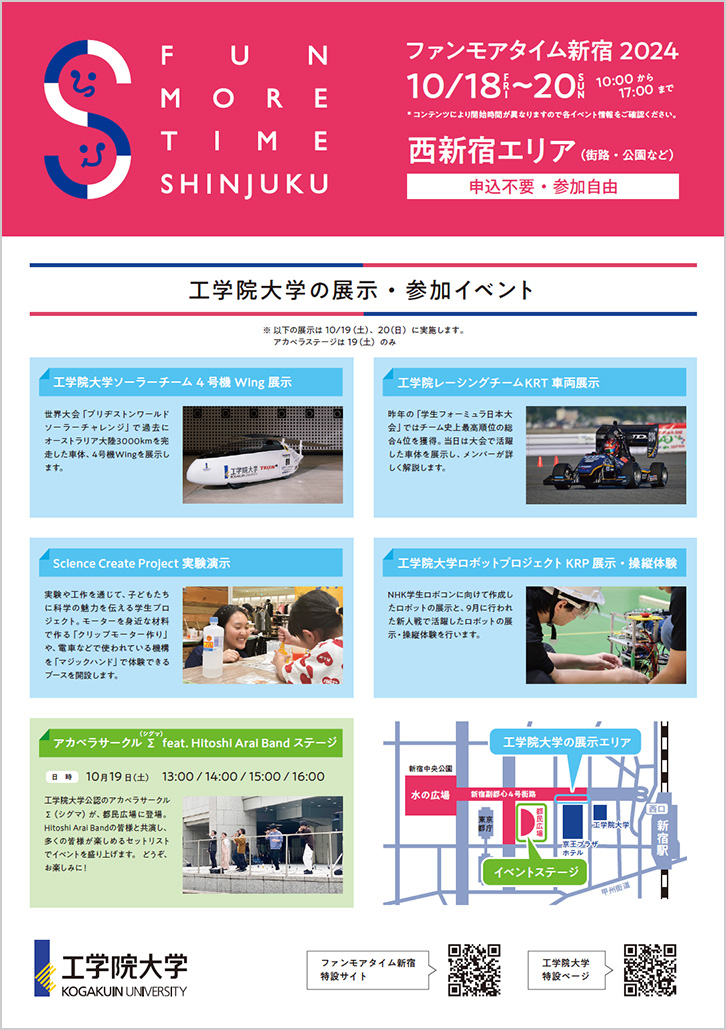 | 本学の出展イベント | ・工学院大学ソーラーチーム4 号機Wing 展示 ・工学院レーシングチームKRT 車両展示 ・Science Create Project 実験演示 ・工学院大学ロボットプロジェクトKRP 展示・操縦体験 ・アカペラサークル Σ feat. Hitoshi Arai Band ステージ ※日時:10月19 日(土)13:00 / 14:00 / 15:00 / 16:00 場所:都民広場 |