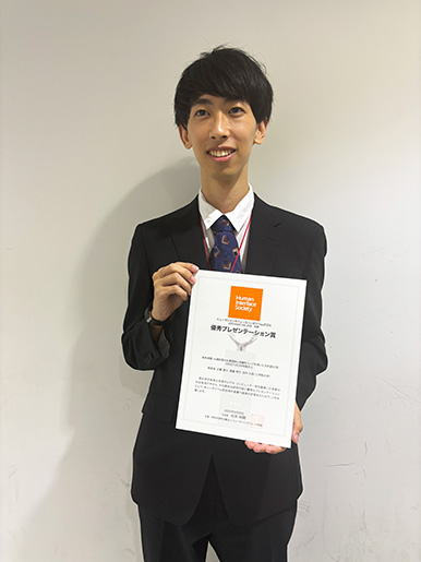 この度は優秀プレゼンテーション賞をいただき光栄に思います。ご指導いただきました田中久弥教授と近藤蒼大先輩、実験に協力してくれた学生方、そして貴重なご意見をくださった学会関係者のおかげです。感謝申し上げます。今後も研鑚を重ね社会に貢献できるよう邁進していきます。
