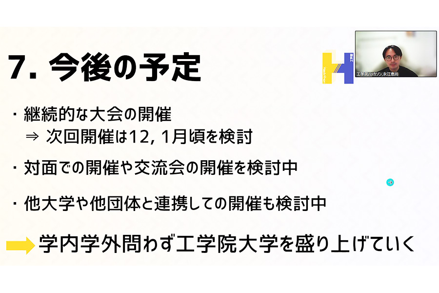 「工学院ハッカソン」の発表では、これまでに開催した2回の大会の活動実績や、最優秀賞を獲得した作品の紹介がありました。「ハッカソンの魅力を50人以上に伝える」という目標のもと、公式HPやチラシの作成に試行錯誤し、広報活動にも力を入れた結果、回を追うごとに大会の参加人数が増加したと語っていました。これまでの活動を振り返り、代表の永江恵尚さん(情報デザイン学科3年)は、「新しいことを始める難しさを知り、成長できました」と話しました。
