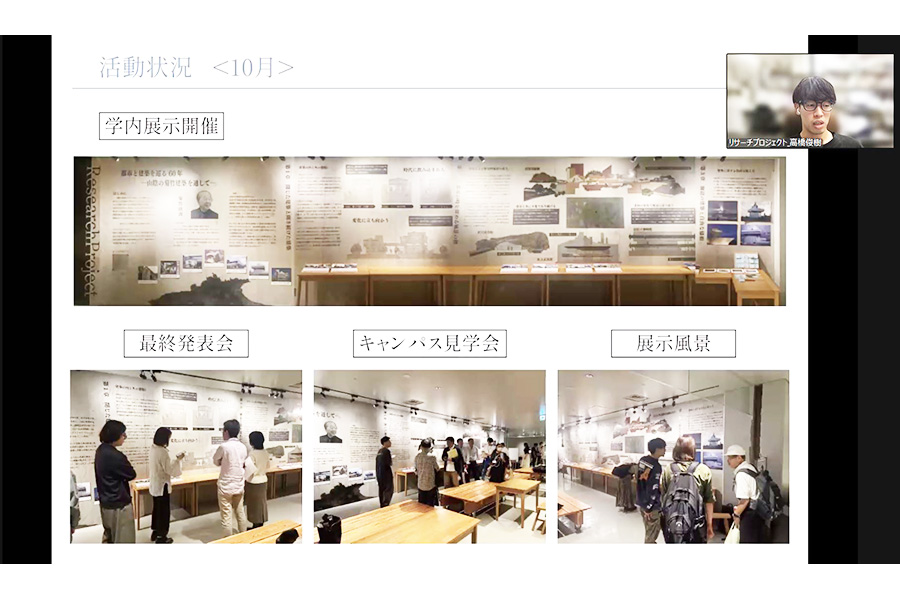 「リサーチプロジェクト」の発表では、10月に学内で行われた展示会「都市と建築を巡る60年」の開催に至った経緯や、その実施結果についての紹介がありました。展示会には、工学院大学建築学部に関心を持つ多くの学内外の方々が訪れ、様々な交流が実現しただけでなく、今回の研究成果が旧島根県立博物館での展示やギャラリートークの開催に繋がったとの報告がありました。代表の高橋俊樹さん(建築学専攻1年)は、「展示会を通じて学外の学生との共同プロジェクトの可能性が見えてきたことや、訪れた方との交流を通じて展示内容を深めるための改善点が得られました」と話しました。