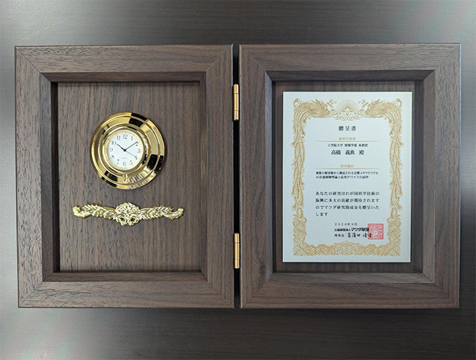 高橋義典 准教授(情報デザイン学科)による研究「複数の障害物から構成される音響メタマテリアルの音速制御理論と応用デバイスの試作」が、第40回マツダ研究助成に採択されました。式では、贈呈書が同財団から高橋准教授に直接接授与され、その後は研究内容やマツダ財団における青年健全育成等について懇談し、大変和やかな式となりました。