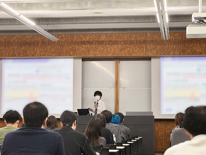 先行して行われた実施された学科内での発表では、他学科の学生にも理解できるように説明することをコンセプトに、1スライド1分程度で説明するルールのもと発表を実施。学生は要点をまとめながらプレゼンテーションを行いました。各学科で2名の代表学生を選出し、後半は学部全体で発表しました。