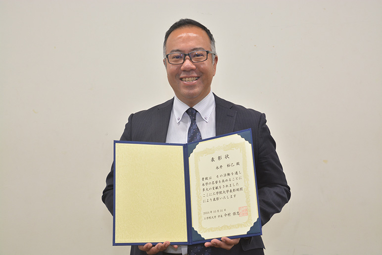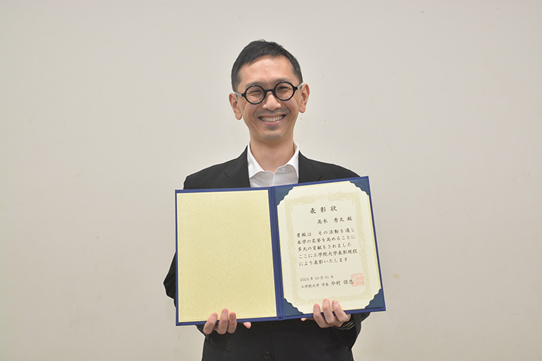 10月31日に開催された学園創立137周年記念表彰式において、2024年度「工学院大学ベストティーチャー」として賞状と記念品を授与しました。