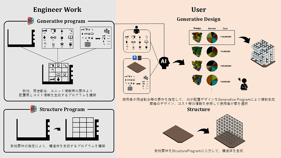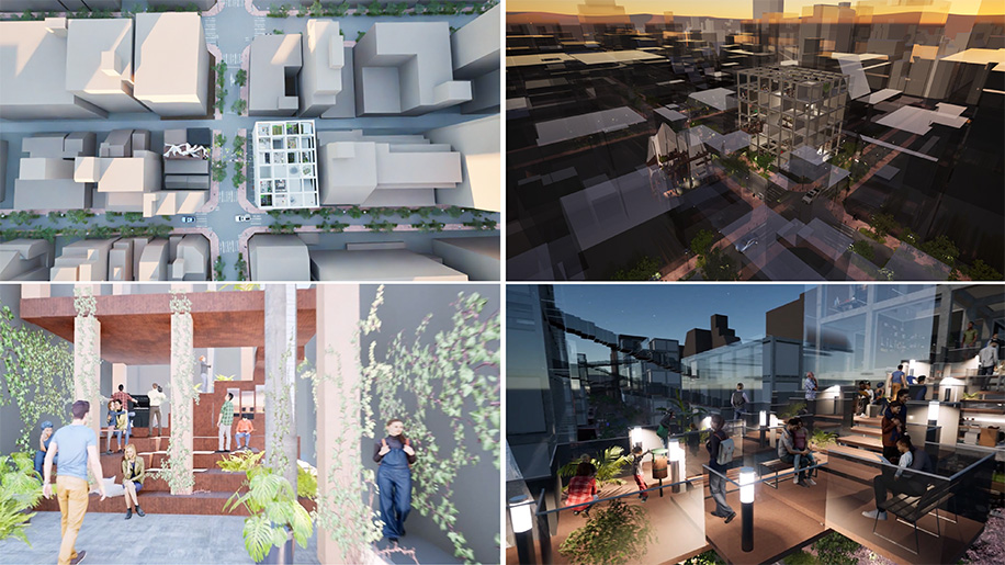 当グループは、BIMを用いて、向かい合う対象敷地にポケットパークと移動式ユニットで構成される複合施設、及びその間を繋げるように、新たな滞留空間を併せ持つ橋を設計しました。ジェネレーディブデザイン等のAIを活用するためのプログラミングを通じた設計により、設計段階及び利用段階であらゆる人々に寄り添ったBIMの在り方をこれからの継承の作法の一つとして提案しました。