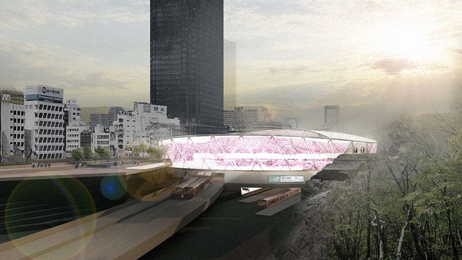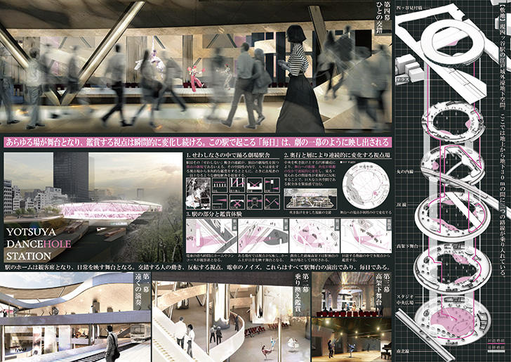 山崎さんの作品では、現代の駅を日常のせわしない動きが独自の躍動感を放つ都市の劇場として捉え、四ツ谷駅において「劇場駅舎」という概念を提案しています。 審査員からは「動線空間としての駅舎、閉じられることが前提の劇場空間、その2つのビルディングタイプを再構築する可能性を持った試み」である点などが評価されました。