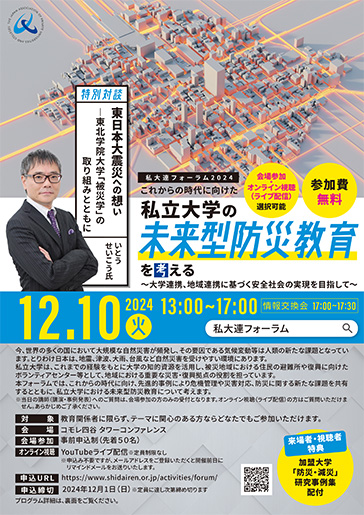12月10日(火)に行われる、私大連フォーラム2024「これからの時代に向けた私立大学の未来型防災教育を考える ~大学連携、地域連携に基づく安全社会の実現を目指して~」において、村上正浩教授(まちづくり学科)が、事例発表を行います。