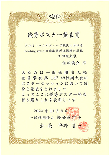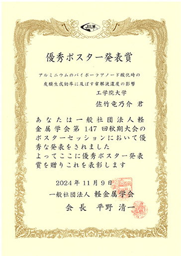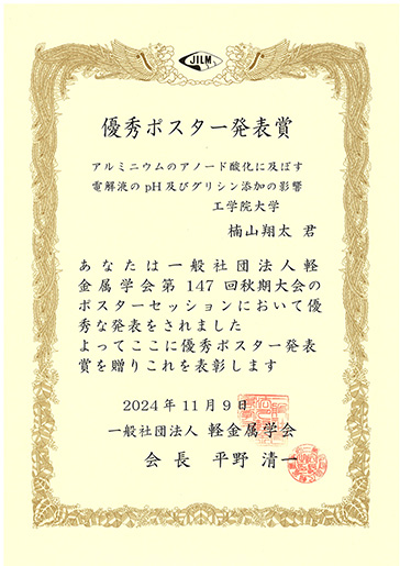 11月9日(土)に群馬大学太田キャンパスにて開催された一般社団法人軽金属学会第147回秋期大会において、化学応用学専攻修士2年の楠山翔太さん、修士1年の佐竹竜乃介さん、村田優介さん(ともに無機表面化学研究室・阿相英孝教授)がそれぞれ優秀ポスター発表賞を受賞しました。