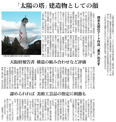 1970年の大阪万博を象徴する「太陽の塔」の重要文化財指定を目指し、大阪府が報告書を作成・発表したことを受け、後藤理事長は、重要文化財が美術工芸品と建造物の二つに大別される中で、両者の特性を併せ持つ「太陽の塔」を「大規模な美術作品の内部を利用できる巨大建築物」と位置づける一方、パブリックアート的な作品を美術工芸品として評価する難しさを指摘しました。また、「イベントのレガシーを文化的に評価することは重要だ」と述べ、「太陽の塔」を文化財として評価する意義を明確にしました。