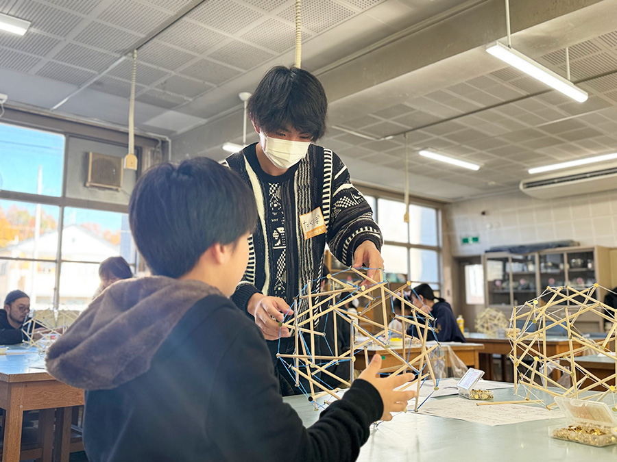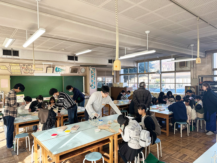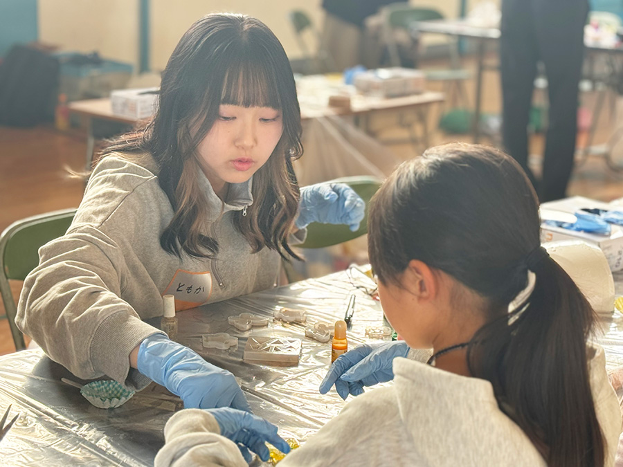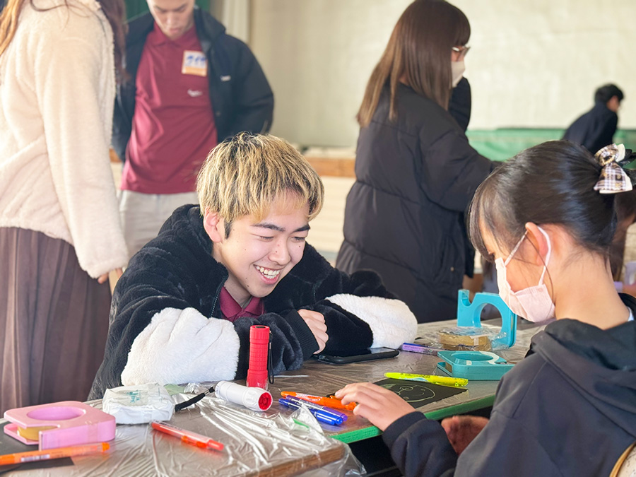 工作ブースでは、学生は児童に寄り添いながら作り方を丁寧に指導し、一緒に制作に取り組みました。完成した作品を手にした児童は、満面の笑みを浮かべていました。