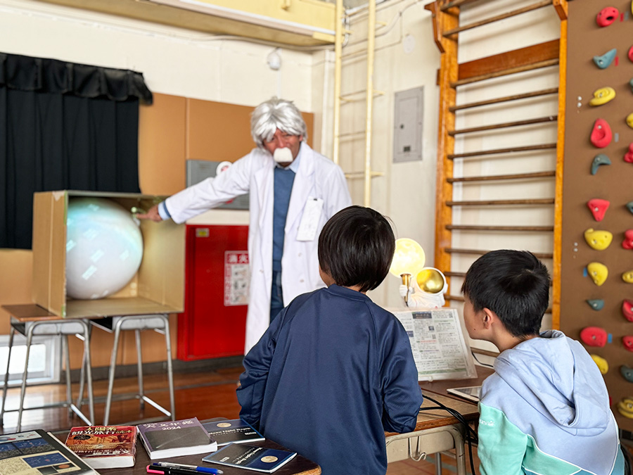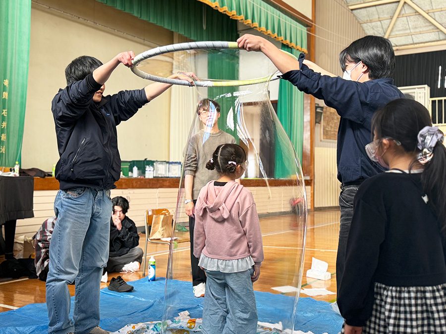 体験ブースでは、巨大なシャボン玉や地球儀の模型が特に注目を集めました。児童は感じた疑問を先生や学生に質問しながら、科学を通じた学びの楽しさに触れていました。