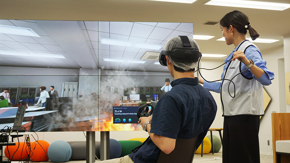 また、能美防災株式会社の協力のもと実施された火災臨場体験VRでは、オフィスビル内での地震や火災発生から避難に至るまでのシミュレーションを体験。参加者はVRを通じて非日常の状況に没入し、災害発生時に何が起こるのかを自分ごととして考えるきっかけとなりました。