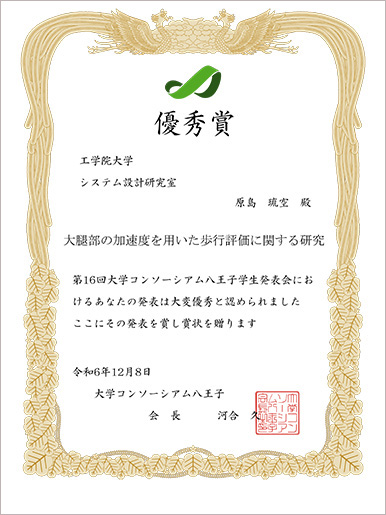 12月8日に八王子市学園都市センターで開催された第16回大学コンソーシアム八王子学生発表会において、機械理工学科3年の原島琉空さん(システム設計研究室・齊藤亜由子准教授)がポスター発表優秀賞を受賞しました。