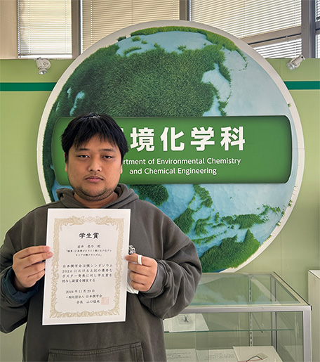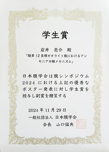2024年11月28日から29日にかけて滋賀県立文化産業交流会館で開催された「膜シンポジウム2024」において、化学応用学専攻2年の岩井亮介さん(環境計算化学工学研究室・高羽洋充教授)が学生賞を受賞しました。