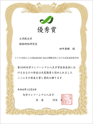 2024年12月8日に八王子市学園都市センターで開催された大学コンソーシアム八王子において、先進工学部応用物理学科学部4年の田中恭輔さん(固体物性研究室・尾沼猛儀教授)がポスター発表優秀賞を受賞しました。