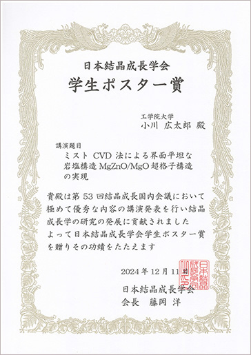 2024年11月18日から20日に開催された「第53回結晶成長国内会議(JCCG-53)」において、電気・電子工学専攻 博士後期課程2年の小川広太郎さん(固体物性研究室・尾沼猛儀教授)が学生ポスター賞を受賞しました。