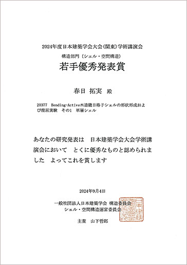 2024年8月27日から30日にかけて明治大学で開催された「2024年度日本建築学会大会(関東)学術講演会」において、30日に研究発表をした建築学専攻修士2年の春日拓実さん(山下研究室・山下哲郎教授)が構造部門(シェル・空間構造)若手優秀発表賞を受賞しました。