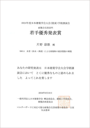 2024年9月30日に開催された「2024年度日本建築学会大会(関東)学術講演会」において、建築学専攻 修士課程2年の片野彩歌さん(安全・安心 久田研究室・久田嘉章教授)が耐複合災害部門若手優秀発表賞を受賞しました。