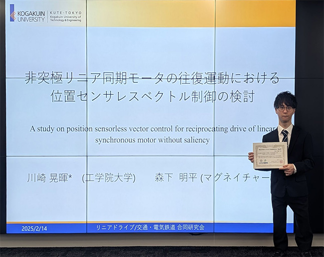 1月23日から24日に福井市民福祉会館で開催された電気学会 リニアドライブ/交通・電気鉄道合同研究会において、電気・電子工学専攻修士課程2年の川崎晃暉さん、石﨑隆也さん(ともに自動運転制御研究室・向井正和教授)が奨励賞を受賞しました。
