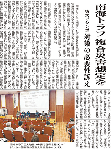 2025年2月22日に徳島大学常三島キャンパスにて開催された南海トラフ巨大地震への備えをテーマとしたシンポジウムにおいて、久田嘉章教授(まちづくり学科)が講演を行ったことが、徳島新聞(2025年2月23日付)に掲載されました。