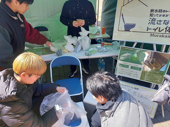 3月8日・9日に新宿中央公園SHUKNOVAで開催された「防災企画展」において、村上研究室(まちづくり学科)が災害時の備えとして「流さない、トイレ体験」のブースを出展しました。