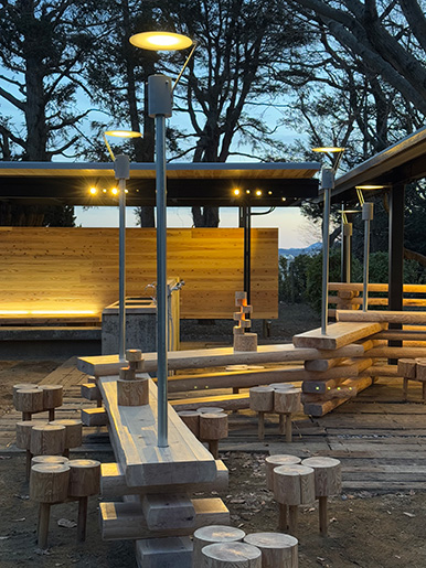 また、バーベキュー場内に設置された原木のバーカウンターやスツール、キャンドルホルダーは、ウッドデザイン賞2024を受賞した鈴木敏彦研究室の作品で、今回のリニューアルにあたり寄贈されました。