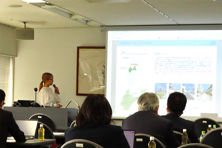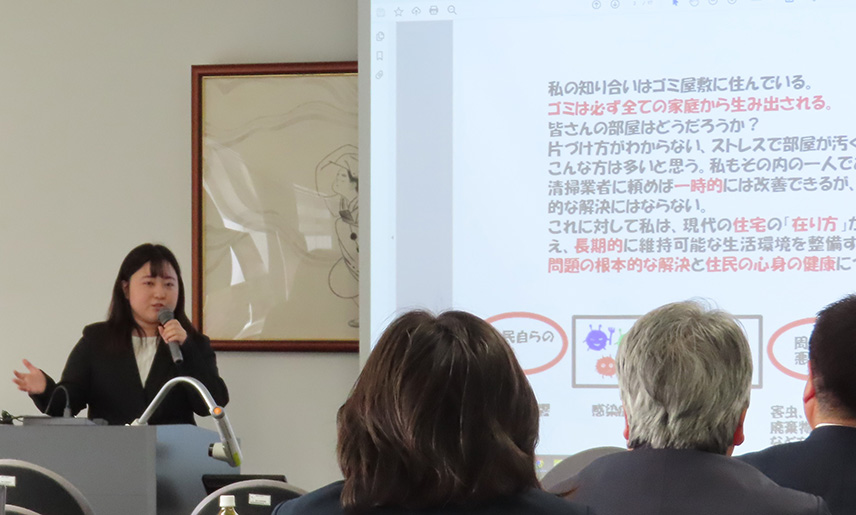 発表後の質疑応答では、最前線で活躍されている企業の方ならではの視点での質問や感想が多く寄せられ、「研究対象地域のみだけではなく、比較対象として、成功事例がある他地域についても調べてみること」への助言や「その住居に住む人の心理面へのアプローチについて」の質問、また、「港湾地区における行政への調査もよく行き届いている」というお褒めの言葉もいただきました。