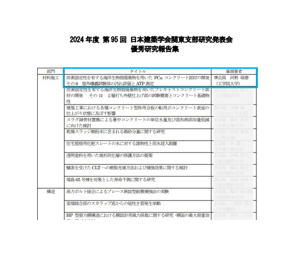 このたび、第95回 日本建築学会関東支部研究発表会 優秀研究報告賞を賜ることができ、誠にありがとうございます。研究の実施に際しては、指導教員である田村先生をはじめ共同研究先の高橋カーテンウォール工業、ATP測定の関係皆様にご指導を賜りました。この場をお借りして御礼申し上げます。この優秀研究報告賞は、日本建築学会関東支部の独自事業として設けられ、会員の研究活動の奨励と活性化の推進を目的としています。