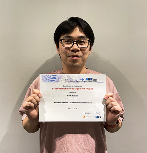 情報学専攻博士後期課程3年の堀内宏基さん(生体情報処理研究室・田中久弥教授)が日本感性工学会で、Presentation Encouragement Awardを受賞しました。