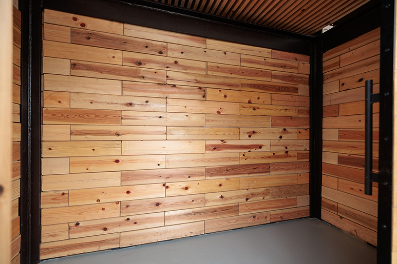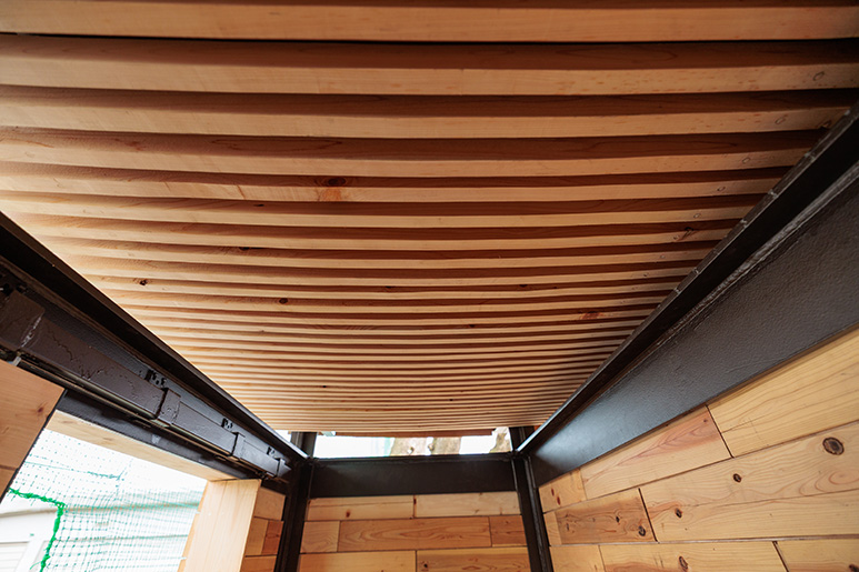 同プロジェクトは、大学キャンパス内や中高で木造倉庫を建てる活動を2017年から続けています。6か所目となる今回は、中高グラウンド脇に倉庫2棟を建設し、体育の授業や部活動で使用される予定です。制作には株式会社東京チェンソーズと株式会社繁田尊友建築設計事務所に協力をいただき、学生約20人が昨年11月から約4か月をかけて完成させました。湾曲させた天井部分のルーバーや道路側の壁、張力と圧縮のバランスで成り立つ「テンセグリティ構造」の考え方を取り入れたデザイン性の高い柵が特徴です。