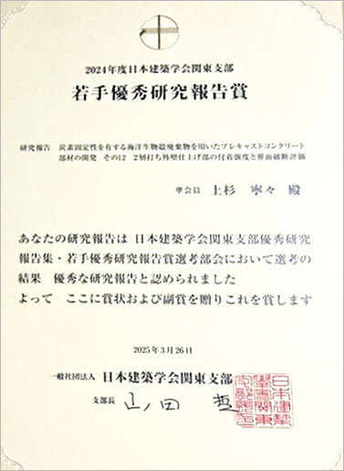 2025年3月5日から6日に横浜国立大学で開催された「2024年度 第95回 日本建築学会関東支部研究発表会」において、建築学部建築学科4年(受賞当時)の上杉寧々さん(田村研究室・田村雅紀教授)が若手優秀研究報告賞を受賞しました。